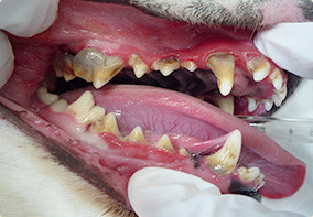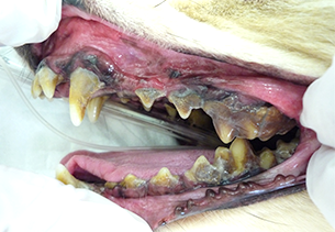 歯垢中の細菌が歯面に付着して、歯周組織が炎症を起こす病気を歯周病といいます。犬や猫の口の中の病気で最も多い病気が歯周病で、3歳以上の成犬・成猫の約80% が歯周病をもっていると言われています。